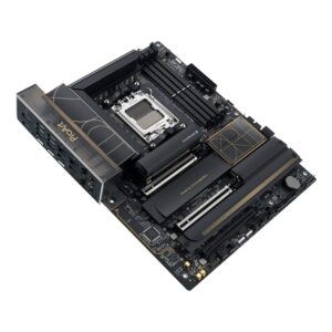Storage flexibility is extensive, with four M.2 slots (two PCIe 5.0 x4 enabled) and four SATA ports, giving creators the bandwidth and space for high-res assets, project archives and scratch disks. PCIe 5.0 x16 support enables workstation-class GPU performance, while ASUS Q-Release and SafeSlot features streamline hardware swaps.